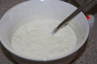 Next, mix together a ratio of 2:1 mayonnaise and vinegar. To be quite honest, this is going to look pretty repulsive until its all mixed together. Keep stirring until it beomes smooth and white.